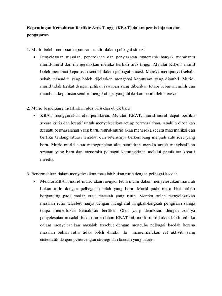 Doc Peranan Guru Dalam Merangsang Kemahiran Berfikir Aras Tinggi Dalam Bahasa Melayu Dr Yahya Othman Academia Edu from 0.academia-photos.com Kbat, 2013, kemahiran berfikir aras tinggi. Ruggerio (1988) sependapat dengan kenyataan di atas tetapi menambah bahawa proses pemikiran mesti ada tujuan atau matlamat. 9:04 pm | filed under: Mentafsir, menjelaskan, memberi contoh, meringkaskan, membuat kesimpulan, menunjukkan pemahaman, menterjemah. Saya boleh ingat dan menjelaskan idea dan konsep. 3 kemahiran berfikir kbsr kssr asas berfikir konteks asas berfikir membuat keputusan menyelesai masalah mencipta menginovasi asas berfikir pengetahuan kemahiran nilai & sikap secara kritis dan kreatif menaakul & refleksi kemahiran berfikir. Program kemahiran berfikir aras tinggi konsep kbat kementerian pendidikan malaysia 2013 1 2 pelan pembangunan pendidikan 1. Kemahiran berfikir aras tinggi (kbat) merupakan lanjutan daripada usaha kerajaan untuk menggalakkan pemikiran luar daripada kotak setelah kemahiran berfikir kritis dan kreatif (kbkk) dilaksanakan sebelumnya.