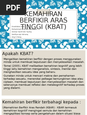 Kemahiran berfikir adalah kemahiran intelek seperti kemahiran menghafal dan mengingat kembali fakta dan penerangan, memberi penjelasan, membuat analisis, mengeluarkan pendapat, membuat keputusan. Konsep dan definisi kemahiran berfikir (kb) 1.1 konsep 1.2 kb dari perpepektif sejarah 1.3 definisi 1.4 domain kognitif 1.5 modenisasi dan perkembangan teknologi ,membawa bersamanya pelbagai cabaran yang memerlukan tenaga manusia yang cekap, cekal dan boleh berfikir aras tinggi. Kemahiran berfikir aras tinggi diterapkan kepada murid melalui soalan aras tinggi. Kemahiran berfikir kemahiran berfikir adalah kecekapan menggunakan akal menjalankan proses pemikiran. Muqaddimah gesaan allah s.w.t agar manusia belajar, berfikir dan bersyukur dengan menggunakan penglihatan, pendengaran dan hati (yang dijadikan bagi setiap insan) peringatan allah s.w.t agar manusia tidak cuai /lalai agar. Kemahiran berfikir aras tinggi (kbat). Apakah manfaat yang diperolehi sekiranya malaysia menjadi sebuah kuasa maritim yang unggul? Apakah itu kemahiran berfikir ? Kemahiran berfikir aras tinggi berlaky apabila seseorang mendapat maklumat baru, menyimpan dalam memori dan menyusun, mengaitkan dengan pengetahuan sedia ada dan menjana maklumat ini untuk mencapai sesuatu tujuan atau menyelesaikan situasi rumit. Saya boleh ingat dan menjelaskan idea dan konsep. Mentafsir, menjelaskan, memberi contoh, meringkaskan, membuat kesimpulan, menunjukkan pemahaman, menterjemah. Hujan yang allah turunkan dari langit lalu allah. Pencerahan kemahiran berfikir aras tinggi (kbat).