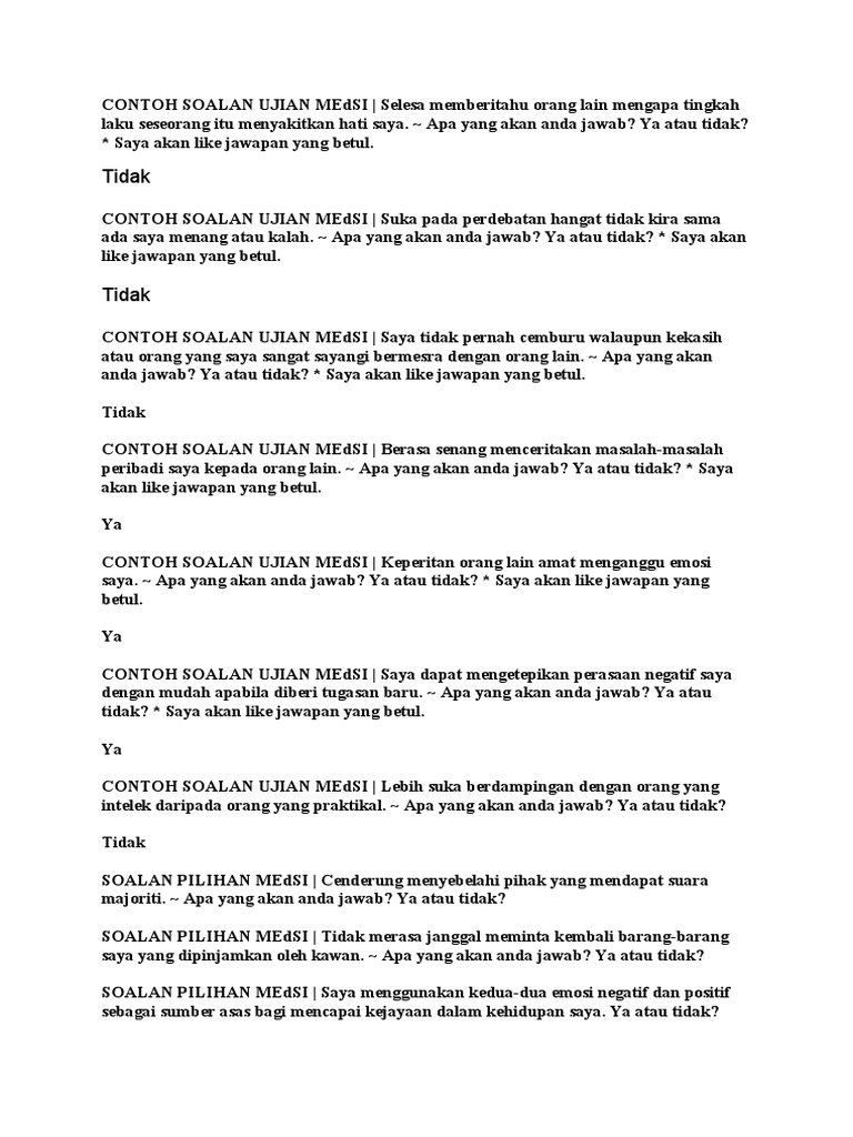 Contoh soalan ujian medsi | saya tidak pernah cemburu walaupun kekasih atau orang yang saya sangat sayangi bermesra dengan orang lain. Malaysian educators selection inventory (medsi) is a selection test for entry into medsi done to all candidates who wish to pursue teaching under the ministry of higher education to ensure that teacher candidates are selected is appropriate in terms of. Pertama ialah ujian personaliti , jawapan kepada ujian ini bergantung kepada personaliti anda secara langsung mahupun tidak langsung. Medsi ni maksud dia ujian inventori pemilihan pendidik malaysia malaysian educators selection inventory (medsi) ialah suatu ujian tapi itu cuma tawaran bukan pendidikan. Ujian medsi adalah satu ujian untuk calon guru yang mengambil ijazah sarjana muda dengan pendidikan. Home > mediasi > apa itu mediasi? Kemudian, barulah calon akan ditentukan samaada layak atau sebaliknya untuk. Soalan dalam ujian ini adalah berbentuk. See more of seminar rahsia lulus ujian temuduga medsi on facebook. Ujian medsi merupakan satu ujian pemilihan untuk memasuki program pengajian pendidikan lepasan stpm / setaraf di ipta seluruh malaysia yang menyediakan kursus dalam bidang pendidikan. Bukan itu sahaja, ujian ini juga untuk menguji profesion anda. Ujian medsi adalah satu ujian untuk calon guru yang mengambil ijazah sarjana muda dengan pendidikan. Ujian medsi adalah satu ujian untuk calon guru yang mengambil ijazah sarjana muda dengan pendidikan.ini adalah penerangan awal tentang apa itu medsi.