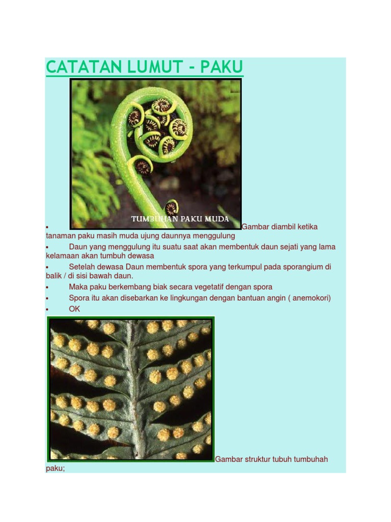 30 April 2011 Nia S Note Sometime Curcol from nheyaya.files.wordpress.com Spora pada tumbuhan paku umumnya muncul di ujung tepi daun atau di bagian bawah daun. Pertikaian jatuh ke tanah dan plat daun kecil tumbuh dari mereka, yang menghasilkan sel seks. Jika ditinjau dari fungsinya, daun tumbuhan paku ada yang menghasilkan spora (sporofil) dan tidak menghasilkan spora (tropofil). Gambar 2.1bagian tumbuhan paku daun paku tumbuh dari percabangan tulang daun yang disebut frond, dan keseluruhan daun dalam satu tangkai daun disebut dengan pinna.jika diperhatikan pada permukaan bagian bawah daun terdapat Beberapa jenis tumbuhan paku (seperti anggota selaginellales dan salviniales) memiliki spora jantan yang berukuran lebih kecil (disebut mikrospora) dibandingkan spora betina (megaspora atau makrospora). Daun tumbuhan paku yang menghasilkan spora disebut sporofil, sedangkan daun yang tidak menghasilkan spora tapi berfungsi untuk fotosintesis disebut tropofil. Penny fern attached to cocoa plant: Inti sel spora dibentuk pada daun dan leaknya pada kotak spora (sporangium).